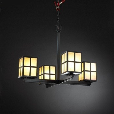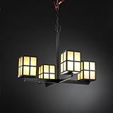 A matte black finish adds to the beauty of our 32 inch four light chandelier with plus design and amber window shades. Ceiling mounted with chain the center light bar has four light arms around the bottom that hold the craftsman plus style window fixtures with beautiful amber glass shades. Suitable for damp locations and includes 6 feet of chain, 10 feet of wire and uses four 100 watt type A 19 bulbs (not included).
