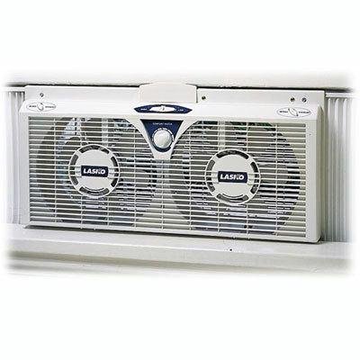 The 8" Electrically Reversible Twin Window Fan adds the convenience of in-window reverse and independently controlled motors, making it one of the most versatile twin window fans on the market. Independent Motor Control for Air Intake, Exhaust, or Exchange. Adjustable Thermostat for Automatic Comfort Control. Two, Whisper-Quiet Speeds. E-Z-Click Expander Panels for a Safe, Custom Fit. Fits Windows 25" to 35" Wide and 12" High and Larger. Fully Assembled for Window Use (Snap-On Feet Included for Table or Floor Use). U.L. Listed.Customer Review: Not bad for the price